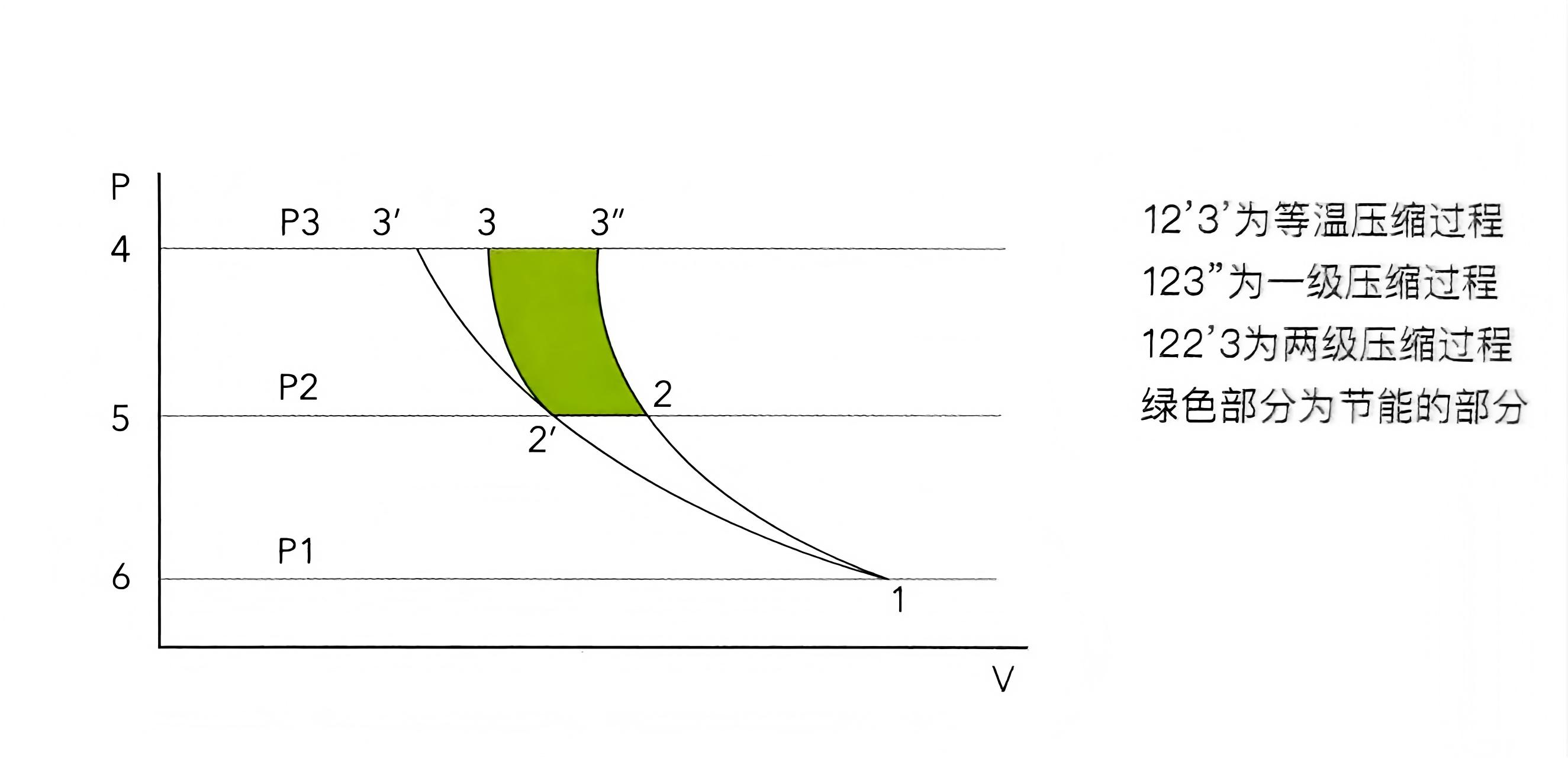 相比于单级压缩,两级压缩机更趋近于等温压缩,比一级压缩节省了2'2-33”面积的功率